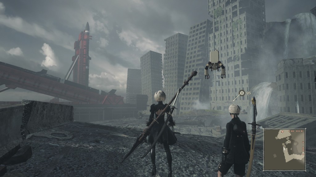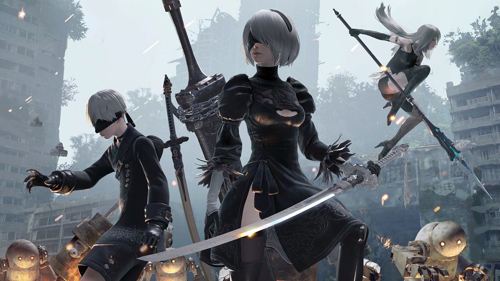 Soldaki erkek android 9S, ortadaki kız 2B ve sağ arka tarafta zıplayan ise A2. Tıpkı GTA V’deki gibi bu oyunda da 3 ana karakterimiz var. Fakat GTA V’den farklı olarak bu oyunu baştan sona toplam 3 kere bitirmeniz gerekiyor. Çünkü gerçek sona ancak böyle ulaşabiliyoruz. Her ana karakterin kendi perspektifinden hikayeyi öğreniyoruz ve buna göre bir sonuca varıyoruz.