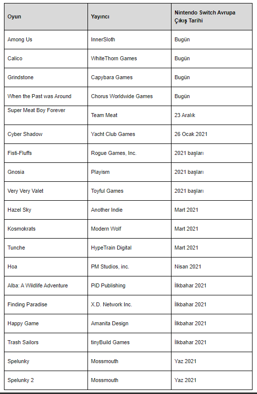 - Spelunky ve Spelunky 2 – Mossmouth: Spelunky ve Spelunky 2 ile, yol boyunca bulduğunuz hayatta kalma malzemeleri ile donatılmış, tehlikeli tünellerden ve mağaralardan geçerken cesur olun. Sırlar, sürprizler ve şakacılıkla dolu yoğun dünyalar içeren oyun, her oynadığınızda tehlike ve zevk vaat ediyor. Bilinmeyenleri keşfederken cüce cinler, hayaletler, uçan balıklar ve dört nala koşan hindilere dikkat edin. Her iki oyun da 2021 yazında Nintendo Switch’te çıkıyor.
