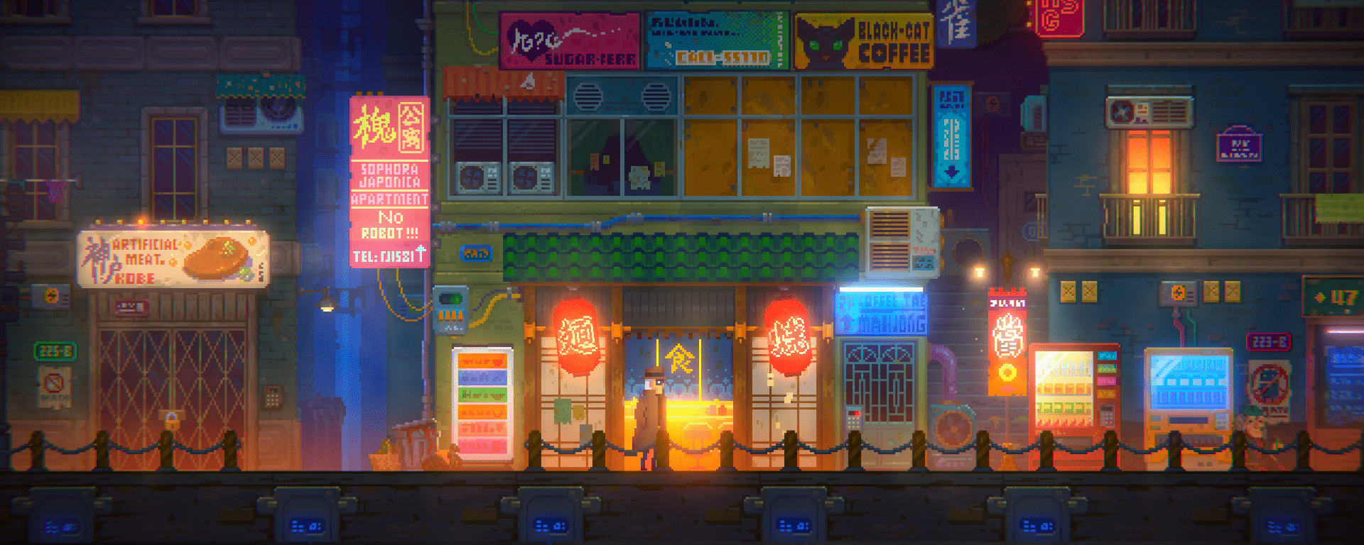 Tales of the Neon Sea, cyberpunk evrende yer alan, bol bol dedektiflik, bulmaca ve kedi içeren bir indie oyun. İlk olarak internette piksel çizimlerine denk geldim. Görselliğe ışık hızıyla aşık olmamın ardından oyunu koşarak satın aldım. Ve oynamak için başına oturdum. Oyun, gerçekten de karşıma çıkan o görseller kadar güzel, hatta daha da güzel görünüyordu. Mekan tasarımları öyle detaylı, dolu dolu ki, incelerken epey bir vakit kaybediyorsunuz. Harika görünmelerinin yanında, etrafa serpiştirilmiş, oyunun evrenine veya başka içeriklere gönderme yapan çok tatlı detaylar var. Her yeni odaya veya mekana girişinizde heyecan duyuyorsunuz. Oyunun en güçlü yanı şüphesiz ki bu görsellik.
