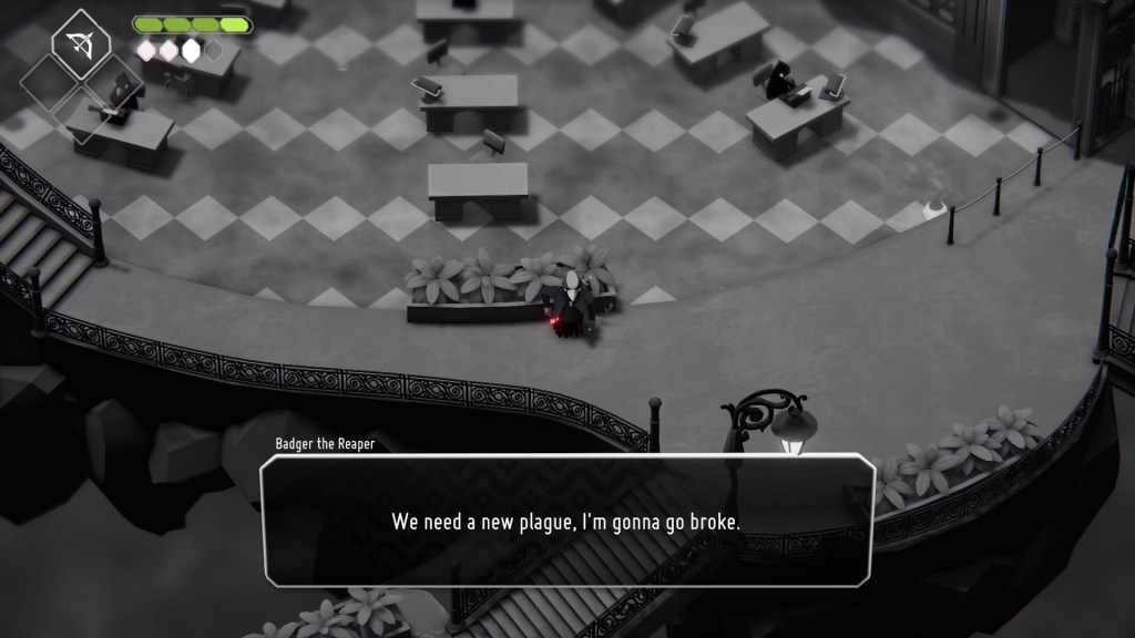 Bu sevimli görselliğe sahip oyunda küçük bir kargayı oynuyoruz. Bu karganın görevi çeşitli kapılardan girmek ve içerideki bossun ruhunu almak. İlk girdiğimiz mekanda pek çok karga görüyoruz ve burası da bir ofise benziyor. Bu ofiste bizim karganın yaptığı işi yapanlara ”Reaper” ismi veriliyor.