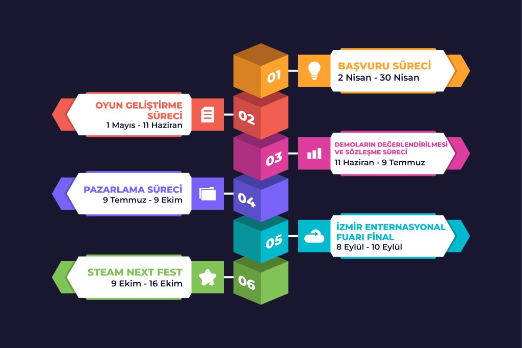 1 Mayıs’ta başlayacak olan oyun geliştirme sürecinden 6 hafta sonra geliştirici ekiplerin oyunları değerlendirilecek ve sözleşme sürecine girilecek. Sözleşme imzalanan ekiplerin oyunları için pazarlama çalışmaları başlarken oyunlar geliştirilmeye devam edilecek. 8-10 Eylül tarihleri arasında İzmir Enternasyonal Fuarı’nda Dora “Stratera” Özsoy sunuculuğunda gerçekleşecek final ile ilk üç ekibe ödül olarak toplam 100.000 TL değerinde pazarlama bütçesi sağlanacak. 9 Ekim’de gerçekleşecek Steam Next Fest başta olmak üzere birçok festivale katılım sağlanacak ve sözleşme imzalanan her ekibin oyunu Next in Game bünyesinde yayımlanacak.
