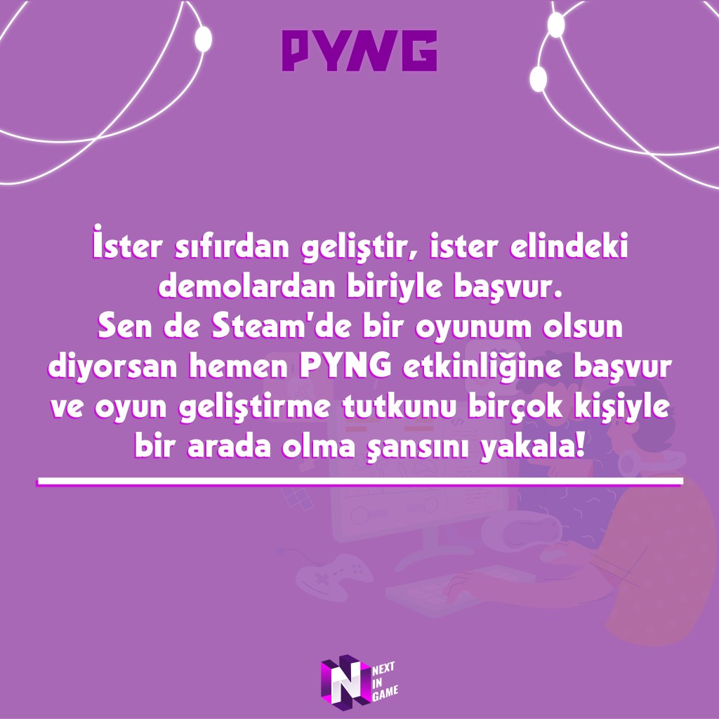 Bu bir Game Jam değil! Game Jam’den farklı olarak oyun geliştirmekten Steam’de yayınlamaya kadar olan tüm süreci kapsıyor. Publish Your Next Game, bir oyun yayınlama etkinliğidir. Kesinlikle Türk oyun ekosistemine büyük katkı sağlayacak etkinliklerden biri. Biz de Geeklik ve Ötesine olarak bu etkinliğin medya partneriyiz.