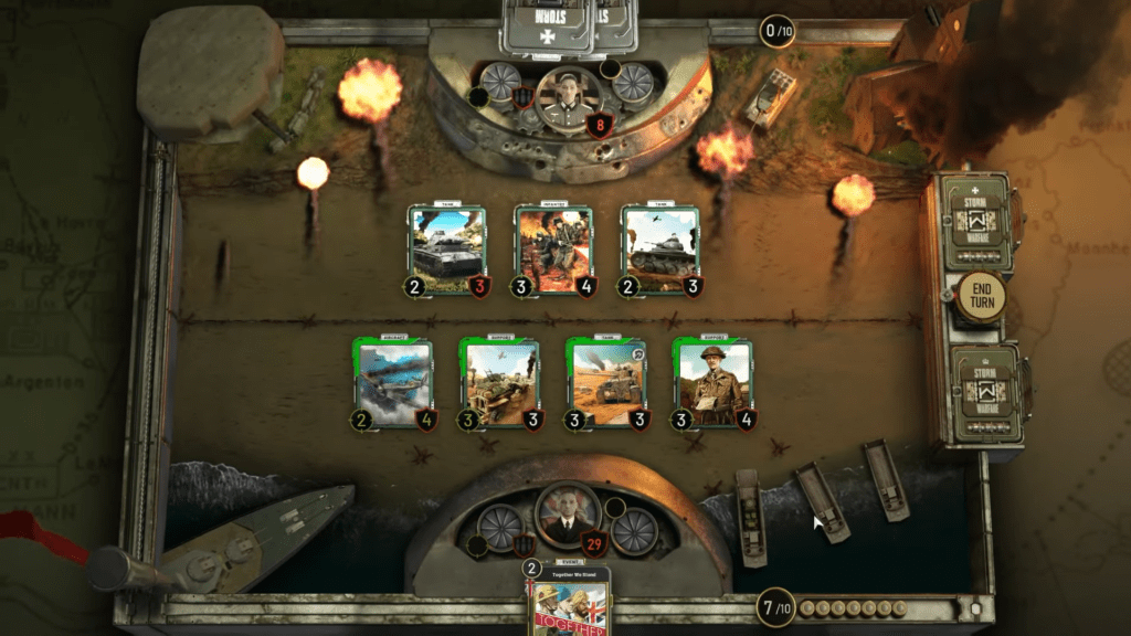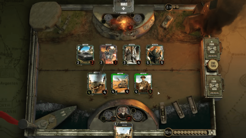 Elbette tur bazlı bir oynanış bizi karşılıyor. Klasik kart oyunlarında olduğu gibi her turda bize sınırlı bir enerji/aksiyon puanı veriliyor. Her turda bu puan artıyor. Elinizdeki kartlara göre puanı maksimum verimlilikte harcamaya çalışıyorsunuz. Oyunda şimdilik İngiliz İmparatorluğu, Almanya ve Birleşik Devletler’in desteleri var. Bu desteler de kendi içlerinde Supporter, Tank, Aircraft gibi bölüklere ayrılıyor. Ama bunlar başlangıç desteleri. İsterseniz kendi özel destenizi de yaratabilirsiniz. Oyun başında destenizden 3 kart çekiyorsunuz ve kartlarınızı beğenmezseniz ilk kartları değiştirme şansınız oluyor. Komutanın yani sizin ana canınız 30 olarak başlıyor. Bunu artırma veya iyileştirme kartları var. Sıfıra düştüğünüzde doğal olarak kaybediyorsunuz. Belirli kartlar dışında düşmanın kartlarını umursamadan doğrudan komutana saldırabilir, oyunu bitirmeye de çalışabilirsiniz. Tamamen sizin stratejinize bağlı.