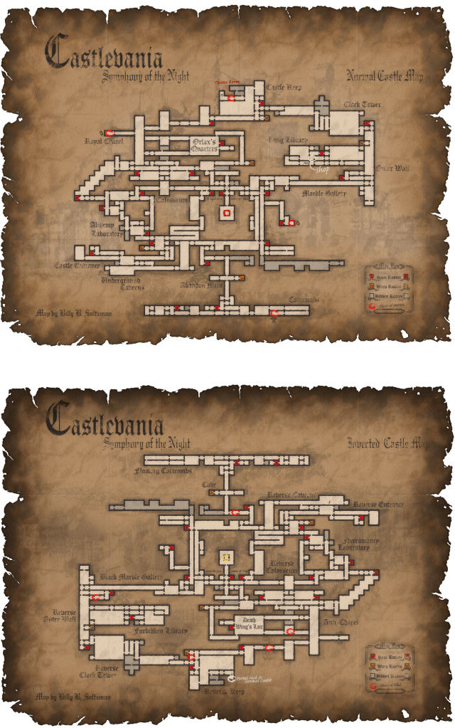 - Aşağıdaki görselde, Castlevania’da oynadığımız kalenin haritası var. Oyunda ilerlediğimizde, bulunduğumuz kale terse dönüyor, ve biz bu ters kalede oynamaya başlıyoruz. Eskiden göremediğimiz yerleri görüyoruz, ulaşamadığımız yerleri keşfediyoruz ve yeni düşmanlarla karşılaşıyoruz. Yani aynı haritayı tekrardan, ama tamamiyle farklı bir deneyimle oynuyoruz.
