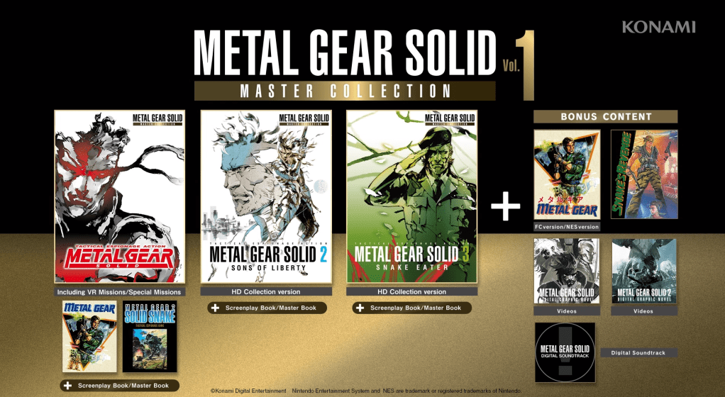 Öncelikle 3 ana Metal Gear Solid oyunu da var. Yani siz bu seti aldığınızda Solid Snake, Raiden ve Big Boss’un orijinlerini rahatça oynayabiliyorsunuz. Bunun yanı sıra MSX’e çıkmış ilk iki Metal Gear oyunu ve Snake’s Revenge yan oyunu da koleksiyona dahil. Aynı zamanda MGS ve MGS 2 için iki tane dijital grafik roman içermenin yanı sıra tüm oyunlar için de senaryo kitabı ve birer ana kitap içermekte. Soundtrack’in de olduğunu zaten söylememe gerek yok ama asıl bomba haber: bonuslar arasında Metal Gear Solid serisinin THE BEST İS YET TO COME, CAN’T SAY GOODBYE TO YESTERDAY ve SNAKE EATER gibi ikonik temalarının yeniden kaydedilmiş, orkestral yorumlarını içeren dijital oyun müzikleri albümü de bulunuyor.