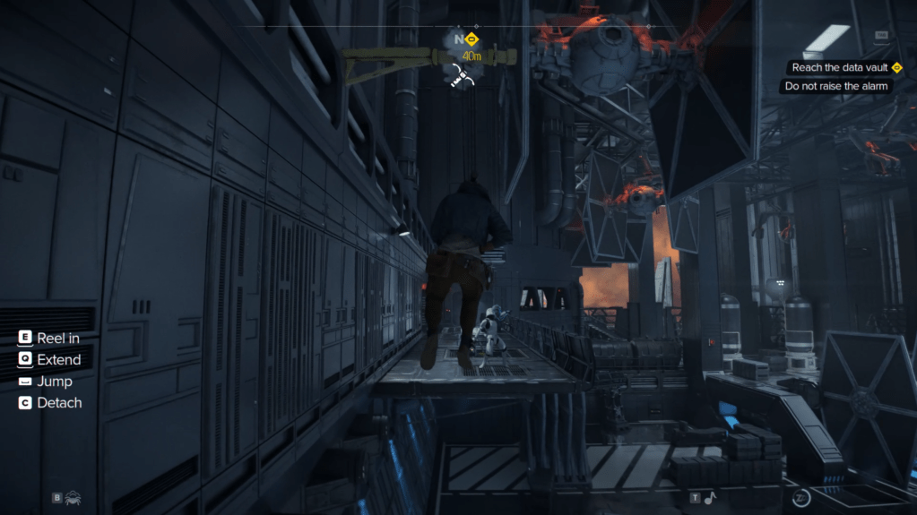 Karakterlerin kontrolü, Assassin’s Creed serisiyle kıyaslandığında çok daha tatmin edici. Ne fazla hantal ne de gerçek dışı bir hafiflikte; tam kıvamında bir denge yakalanmış. Silah kullanımı (gunplay) oldukça doyurucu, yani vuruş hissi gayet iyi. Ancak aksiyon çeşitliliği pek yok. Ana silah olarak sadece bir Blaster’ımız var. Onu çeşitli şekillerde modifiye ediyoruz, o kadar. Fragmanlarda bu durum çok büyük sıkıntı yaratır mı diye düşünmüştüm ama pek sorun olmamış. Çünkü platform, bulmaca, seyahat, sinematik aksiyon ve gizlilik kısımlarıyla bunu aşmışlar. Combat’ı bu döngünün içine yerleştirdikleri için, çok sık şekilde arka arkaya aksiyona girmiyorsunuz. Bu da oyuncuyu bir nevi dinlendiriyor. Hatta bir ara aksiyona girince uzun süredir savaşmadığımı fark ettim. Yalnız uyarayım, gizlilik sekansları bazı oyuncuları bunaltabilir. Çünkü zorunlu bir şekilde gizli ilerlemeniz gereken görevler var. Gizliliği sevmeyen oyuncular, tekrar tekrar hata yaptıklarında bu görevlerden iyice sıkılabilir. Ben sadece bir görevde zorlandım, geri kalanında çok keyif aldım. Uzay gemimle devasa bir İmparator Gemisi’ne sızmak inanılmaz heyecanlıydı. Özellikle harika müzikler sayesinde. John Williams’ın unutulmaz film müziklerine yakışır şekilde oyuna özgün müzikler bestelemişler.